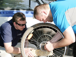 Okazało się, że oba rowerki gospodarzy, które miały wziąć udział w wyprawie, wymagają niezbyt poważnej, a jednak natychmiastowej interwencji technicznej. Wraz więc z kolegą przybyłym, korzystając z nieprzebranych bogactw narzędziowych gospodarza, zabraliśmy się do przecudnej zabawy: